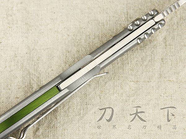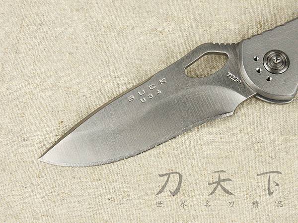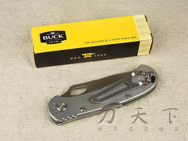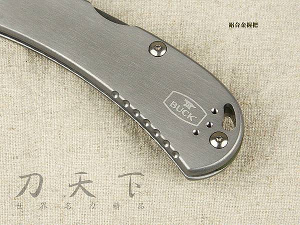 Spitfire注重細節也在外型上看得出來,例如:刀擋特別採用與握把不同顏色鋁合金,讓沉穩中帶點變化;握把兩面都有Buck的logo,所以更換背夾方向時,總有一面logo會朝外顯現出來。