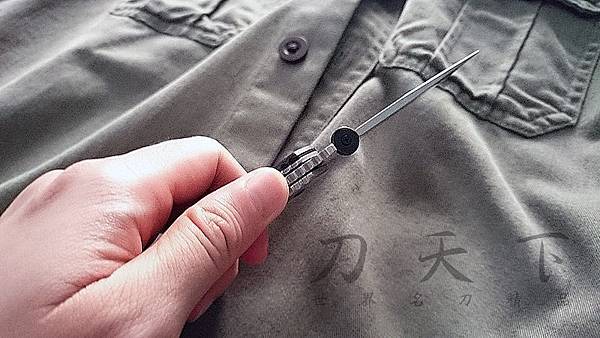 "WAVE"拉鉤,使用方式是將折刀取出褲袋同時,用以鉤住褲袋邊緣並順勢拉出,即可完成展刀動作。
