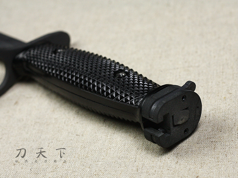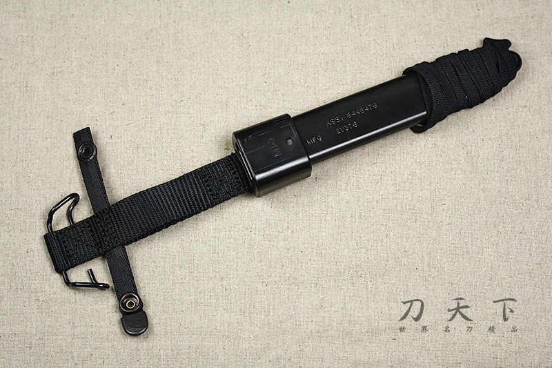 刀鞘,鞘體為高強度塑料製成。可掛於腰帶上,底端鞋帶可將刀鞘綁在腿上固定,不會亂晃。